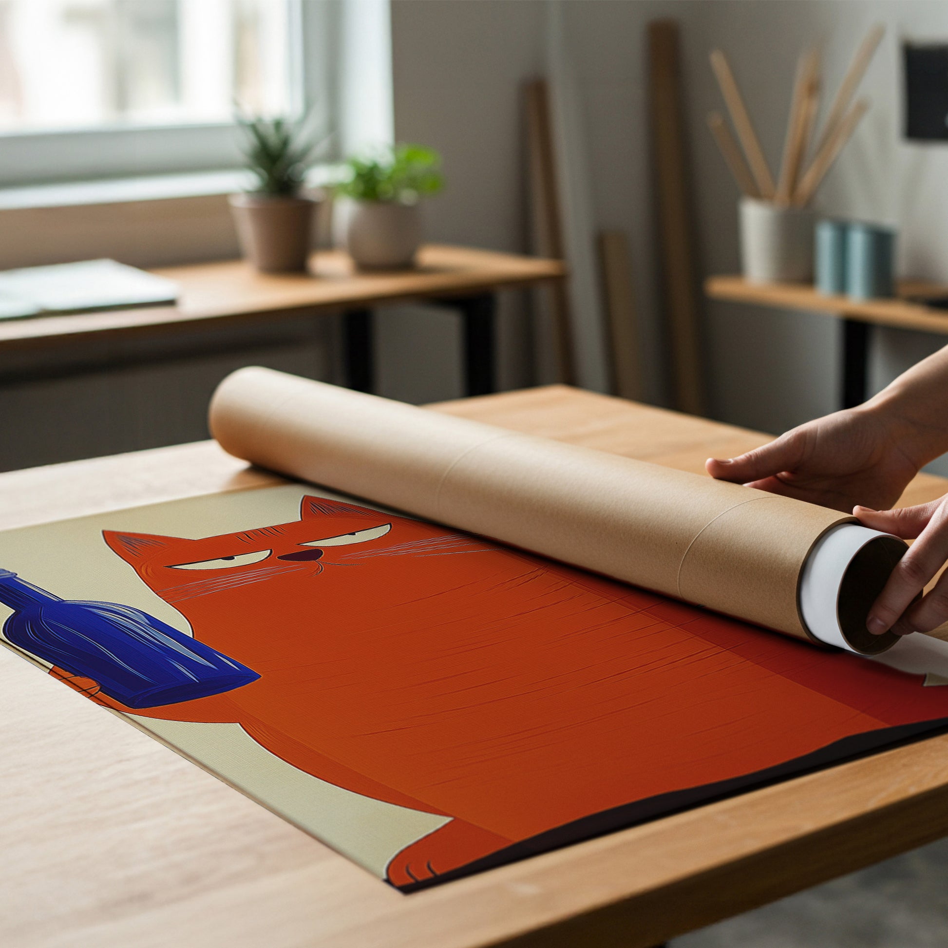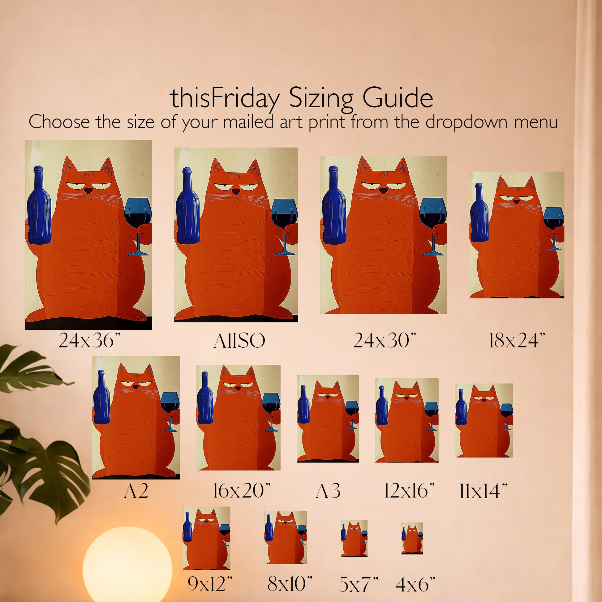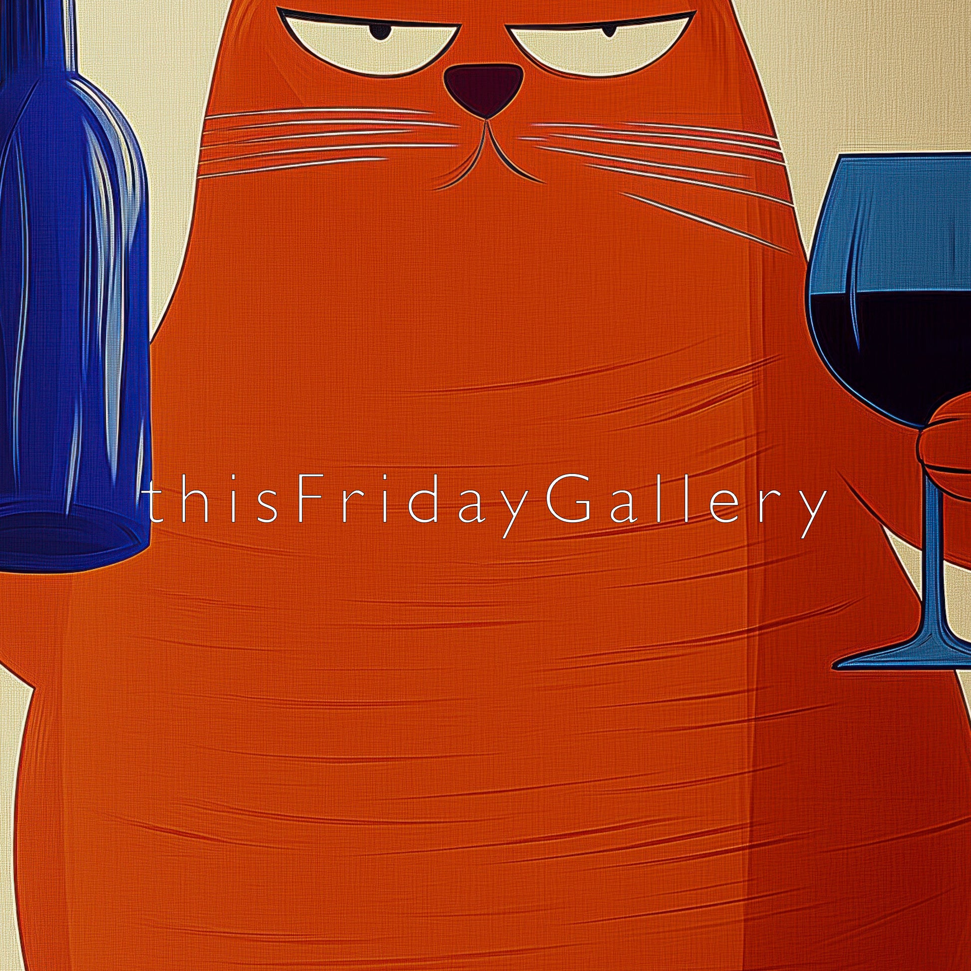 Add a fun and stylish vibe to your space with this charming mid-century modern wall art. Showcasing a large orange cat holding a blue wine bottle and glass, this retro-inspired piece is perfect for bar carts, kitchens, or living rooms. Its warm and inviting colors blend beautifully with mid-century decor, making it a delightful addition to your home or a thoughtful gift for cat and wine lovers alike.